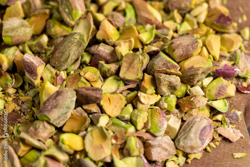 pistachios for cooking , chopped into pieces crispy pistachios fried with salt, close up