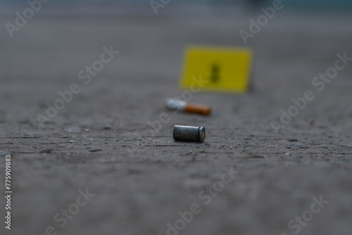 Pistol bullet shell on cement floor with blurred number one yellow paper and cigarette filter scraps background, concept for investigation and crime by police officers and investgators, soft focus.