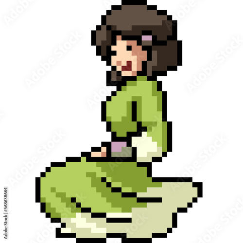 vector, pixel, art, cartoon, icon, doodle, cute, isolated, white background, woman, girl, pretty, asian, japanese, korean, chinese, dress, green, smile, to sit