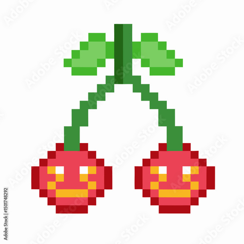 cherry, pixel, art, retro, smiling, fruit, face, leaf, white, background, red, green, vintage, gaming, happy, cute, cheerful, playful, graphic, fun, nostalgia, bright, vibrant, expressive, quirky, nature, symbol, minimal, abstract, icon, decoration, motif, unique