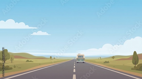recreational vehicles, road trip, travel, landscape, vintage, retro, adventure, journey, open road, asphalt, driving, nature, outdoors, scenic, summer, daytime, blue skies, cloud, grass, tree, hill, horizon, empty, lonely, minimalist, illustration, digital artwork, transportation, vehicle, recreation, vacation, explore, freedom, escape, serene, peaceful, perspective, dusk, dawn, contrast, vibrant