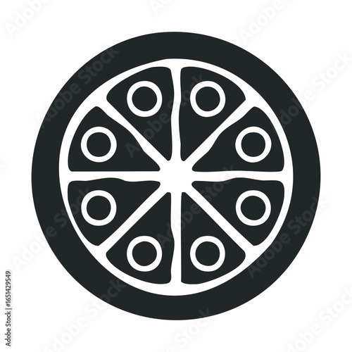 Pizza icon with eight slices and pepperoni toppings in black and white