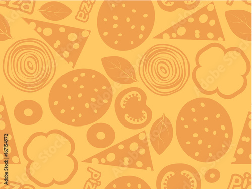 Pizza ingredients simple seamless pattern. Orange color background with salami, cheese, mushroom, olive, basil, tomato, paprika. Web page fill or wrapping paper backdrop