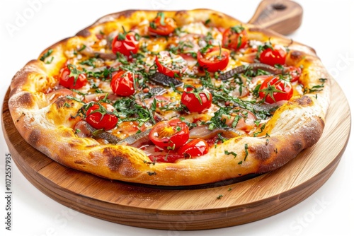 pizza, marinara, traditional, italian, anchovy, cherry, tomatoes, garlic, olive, oil, oregano, isolated, white, background, wooden, plate, close, up, generative, ai, illustration, whole, closeup, black, green, olive, sauce, fish, salted, mozzarella, caper, cheese, parmesan, tomatoes, baked, wood, pizzeria, italy, food, cut-out, eatery, menu, condiment