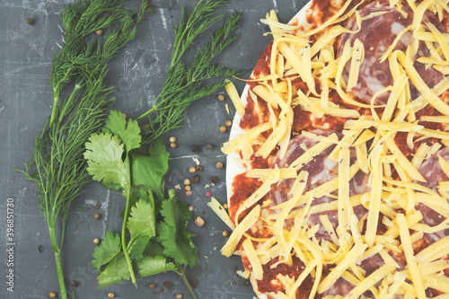 Pizza preparation. Raw dough with grated cheese and ingredients, top view