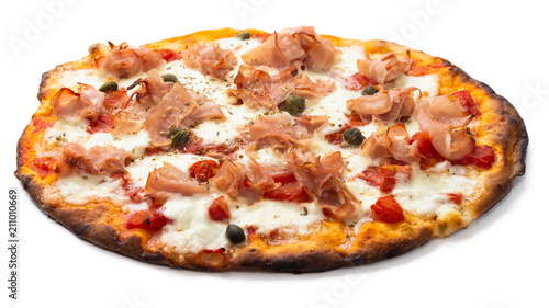 Pizza with prosciutto cotto ham, mozzarella, tomato sauce, capers and oregano