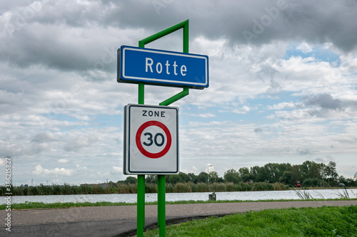 Place name sign of Rotte, a scenic area along river Rotte close to Rotterdam, Holland.