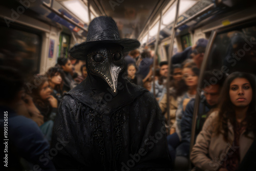 pandemic, crowd, epidemic, contagion, outbreak, disease, infection, public health, blighted, doctor, mask, beak, leather, hat, subway, train, commuter, passenger, transit, transport, metropolitan, urban, allegory, metaphor, eerie, dark, mysterious, scarey, grim, historical, costume, health, virus, surreal, contrast, public, travel, morning, evening, city
