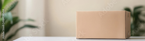 Plain cardboard box on white surface with blurred background of green plants, conveying simplicity and natural tones
