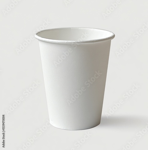 Plain white disposable paper cup standing on a light surface with soft shadow