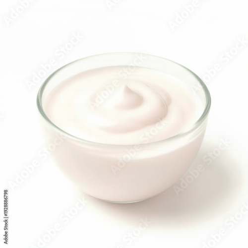 Plain white yogurt with a smooth swirl rests in a small, clear glass bowl against a pure white background.