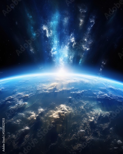 Planet Earth and clouds shine in space under starlight with a dark nebula background