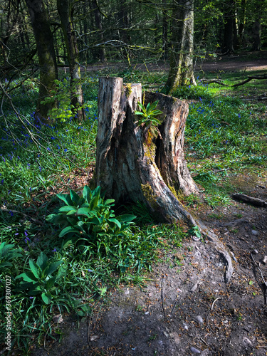Plant growing on oak stump in woodland. Bluebells nearby.