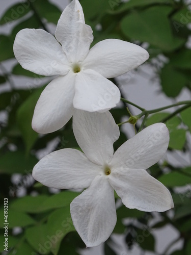 PLANTA. JAZMÍN (JAZMINUM). DOS FLORES BLANCAS DE CINCO PÉTALOS. PEQUEÑAS HOJAS VERDES. FONDO BLANCO.