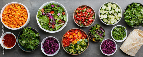 Plant-based cuisine emphasizes sustainability and freshness. Colorful bowls of fresh salad ingredients