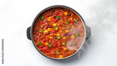 Plant-Based Diet A steaming pot of hearty chili filled with colorful vegetables and spices.