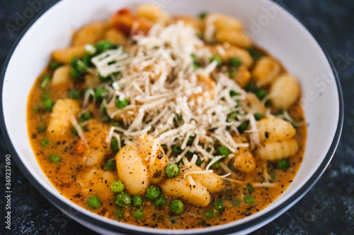 plant-based food, vegan potato gnocchi with sundried tomatoes and peas in red pesto sauce with dairy-free cheese