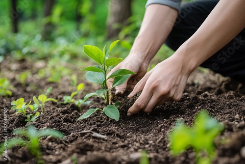 Planting a Young Sapling Tree in Rich Soil Hands Gently Placing a Small Green Plant in Dark Earth Environmental Conservation Growing Nature life hope