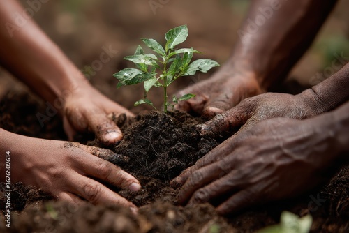 Planting New Tree Sprout Together with Diverse Hands in Fertile Soil. MZ tree, planting, hand, holding, dirtied, ground, growing, young, germinating, together, group, support, close-up, day, green, br