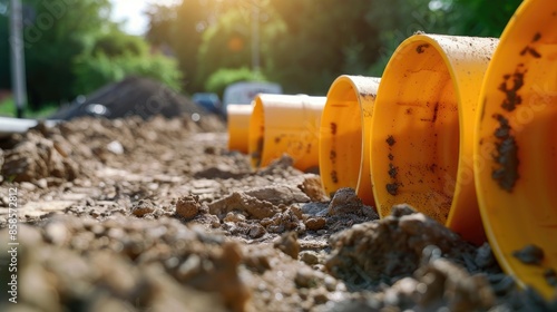 Plastic pipes buried for building construction with space for text