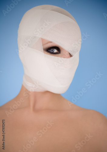 model, female, woman, beauty, beautiful, plastic, surgery, white, band, medicine, medicals, hospital, face, blue, studio, portrait, bandage, covering, head, health, care, vanity, makeover, peeking