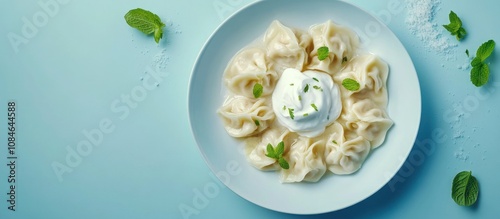 plate of dumplings with dollop of sour cream top view copy space food photography