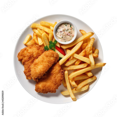 fish and chips, fish, seafood, fried, french fries, chips, food, chicken, meal, dinner, plate, potato, isolated, transparent, white background, up high, topview, overhead, fries