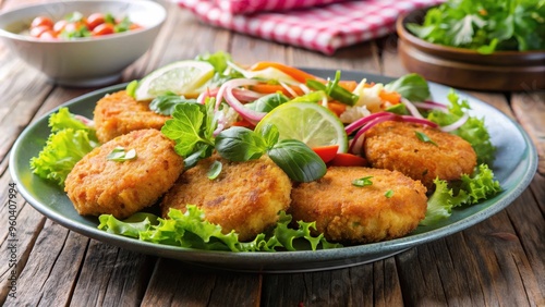 Plate of fried Thai fish cakes served with fresh salad