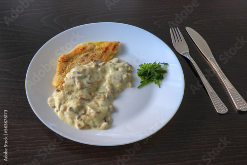 Plate of grilled chicken with mushroom sauce on wooden background.