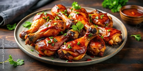 Plate of juicy grilled chicken drumsticks in spicy barbecue sauce, grilled, spicy, marinated, succulent, poultry, barbecue, food, delicious, chicken, juicy, flame-grilled, drumsticks, tasty