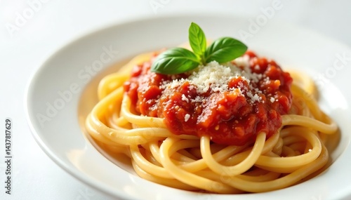 Plate of pasta with tomato sauce, parmesan cheese, basil leaf on white , penne, italian food