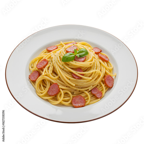 Plate of spaghetti carbonara with sausage and basil on white dish
