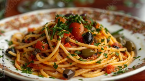 Plate of spaghetti puttanesca with olives, capers, and tomatoes, garnished with parsley