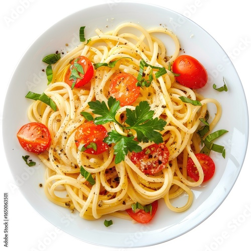 spaghetti, pasta, dish, food, italian, meal, plate, white, tomatoes, cherry, fresh, cooked, noodle, sauteed, delicious, healthy, nourishment, ingredient, vegetable, sauce, parsley, basil, topping, tasty, dinner, lunch, simple, classic, cookery, eatery, homemade, easy, comfort, serving, portion, yellow, red, green, appetising