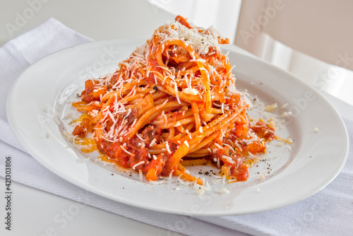 Plate of spaghetti with tomato and bacon and pecorino cheese