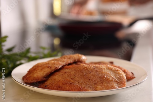 Plate of tasty schnitzels on table in kitchen, closeup