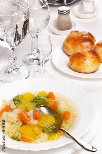 Plate with fresh hot soup on the table and homemade buns