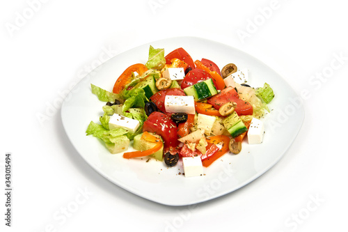 salad, tomatoes, food, vegetable, healthy, isolated, plate, green, dinner, lunch, lettuce, cucumber, white, epicure, delicious, meal, fresh, closeup, leaf, cookery, dish, pepper, freshness, onion, diet, sauce, nobody, tasty, health, red, herb, portion, garnish, organic, natural, ingredient, nourishment, lifestyle, low-fat, vitamin, serving, eatery, menu, appetising, horizontal, cooked, meat, white background, greek