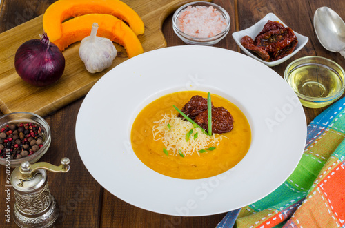 Plate with pumpkin crem soup and dried tomatoes on wooden background