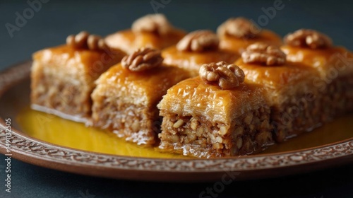 plate, piece, dessert, type, baklava, traditional, middle, colours, caramel, sauce, covered, layer, nut, arranged, circular, pattern, edge, decorated, ornate, design, dark, brown, background, making, focal, diversity