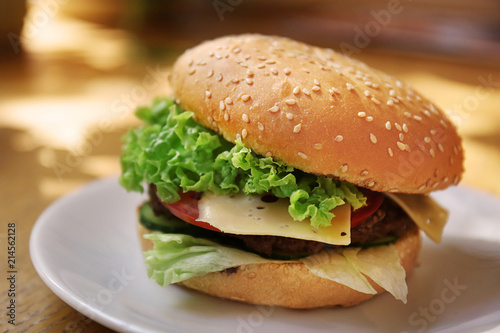 Plate with tasty cheeseburger on table