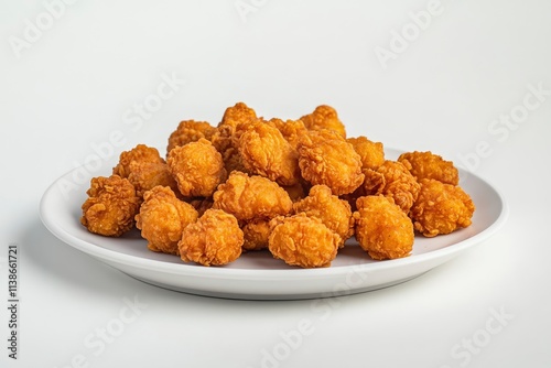 Plate with tasty fried popcorn chicken on white background