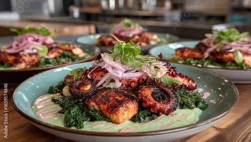 octopus, seafood, dish, plate, greener, spinach, pink, sauce, grilled, seared, eatery, food, meal, delicious, fresh, healthy, cookery, plated, modern, dinner, lunch, tasty, colourful, cooked, vegan, vegetarian, serving, closeup, food photography, rustic, wooden, table, dining, epicure