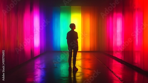 Play of color and light: silhouette of a young man standing in the middle of a room of colored neon-lit panels