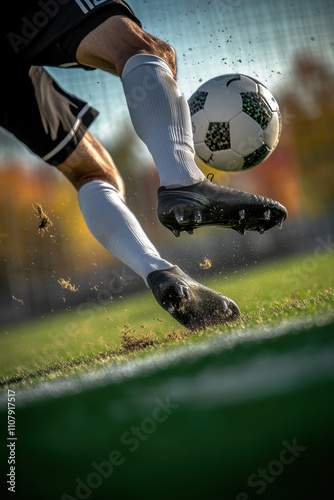 soccer, player, ball, kick, grass, park, autumn, sunlight, sport, action, athletic, fall, competition, footwear, field, game, skill, team, play, movement, summer, recreation, leisure, training, exercise, match, youth, energy, excitement, teamwork, health, fun, running, practice, challenge, goal, turf, victory, enthusiasm, agility, strategy, fitness, concentration, dynamic