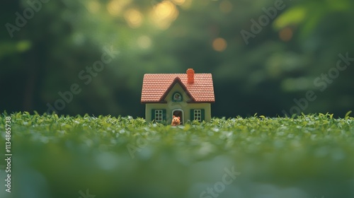 Playful dollhouse among lush green grass in tranquil nature scene captivating viewpoint