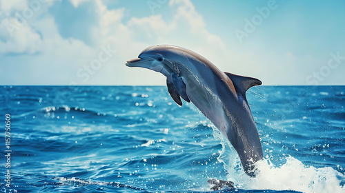 Playful Dolphin Leaping from Sparkling Waves Under Clear Sky: A Marvel of Marine Life and Nature's Beauty