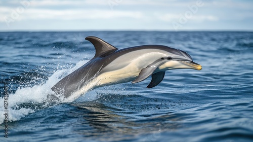 Playful dolphin leaping through ocean waves under bright sky