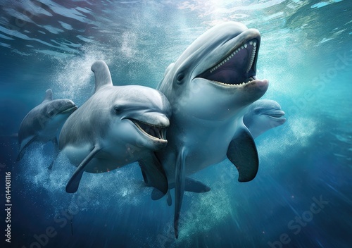 Playful Dolphin Pods beautiful picture. Wallpaper, Background, digital Poster, Generative AI.