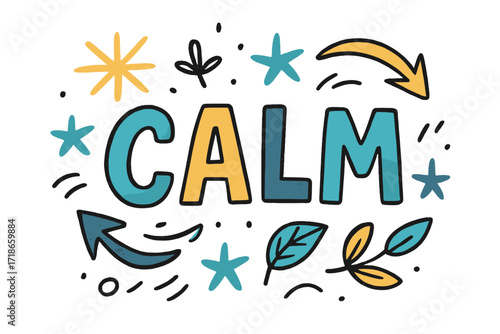 Playful Doodle Art. Calm Doodle ? Doodle/Sketch style, playful hand-drawn letters with arrows, stars, leaves, and soft bursts, casual loose composition, no